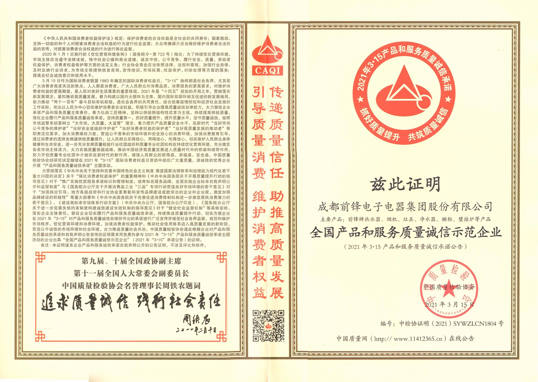 必一运动厨电荣获“全国产品和服务质量诚信示范企业”称号